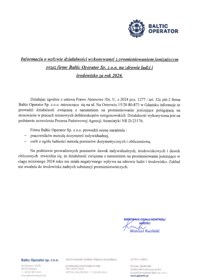 Baltic Operator jest spółką z ograniczoną odpowiedzialnością w Grupie Agencji Rozwoju Przemysłu S.A. Baltic Operator zajmuje się aktywnym zarządzaniem, optymalizacją i rozwojem firm w szeroko rozumianej międzynarodowej branży stoczniowej, energetyki wiatrowej, offshore (oil & gas) oraz infrastruktury przeładunkowej, ściśle współpracując i korzystając z doświadczenia Stoczni Gdańskiej S.A. i GSG Towers sp. z o.o.